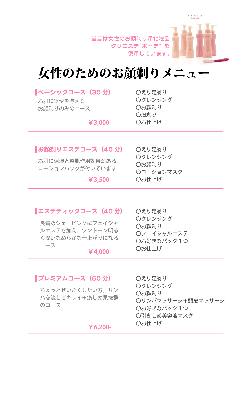 ※お顔剃り後、2〜3日は日焼けしやすい状態になるので 日焼け止めも忘れずにしてくださいね。